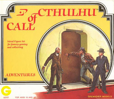I owned the two boxed sets of Call of Cthulhu miniatures, the first of which was dedicated to adventurers (though the box says "adventures," which I assume was an error). Here's the cover, showing Indiana Jones, Al Capone, and Professor Plum preparing to burst into the room behind a closed door.