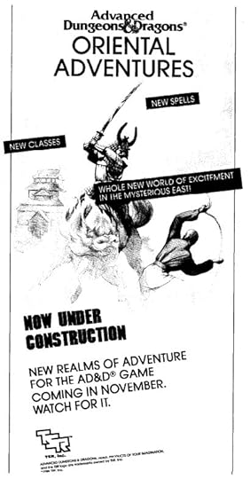 Because I did a Retrospective post on Kara-Tur: The Eastern Realms last week, I was reminded of how excited I was by the announcement that the long-awaited Asian expansion to AD&D, Oriental Adventures. OA was a long percolating project about which Gary Gygax had talked for years beforehand, in part because he felt the monk class didn't belong in "standard" AD&D, given its inspiration in the legends of the Far East. Despite this, there didn't seem to be any evidence that such a project was likely to happen anytime soon and I largely put it out of mind.