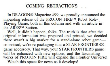 Probably because it was a science fiction RPG and science fiction is my genre of choice, I've long had a mild obsession with Proton Fire, the game that never was. Knowing that it did, in fact, exist in some form, but was never put into publishable form only feeds my desire to know more about it. Alas, I suspect this is a desire that shall never be sated!