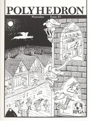 "Notes from HQ" can be quickly dispensed with, since most of it concerns RPGA matters of little lasting interest. The main thing worth discussing is a note indicating that, in response to pleas from the editor in previous issues, there have been a number of submissions from RPGA members. Indeed, Penny Petticord states that "we have not rejected a single article." She quickly adds, though, that submissions are still very few in number and that "only a fraction of the so-called active membership has contributed." At the time there were supposedly "over 8000" RPGA members worldwide, so I can sympathize with Petticord's lament about the small number of submissions.