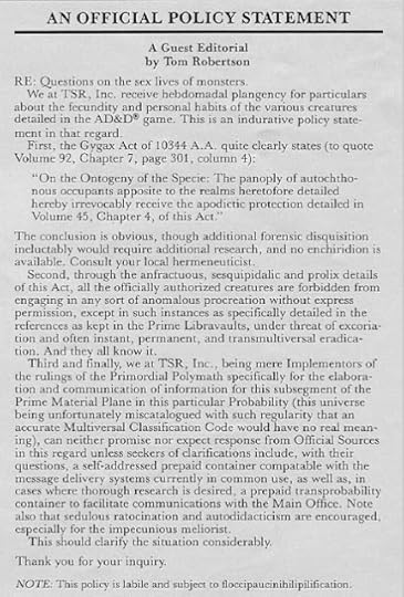 April Fool's issues were a staple of my youth, but they're very difficult to pull off. Partly, that's because humor can be very subjective and, partly, that's because most attempts at humor, especially in writing, are simply not very good. Consequently, I greeted the arrival of issue #23 of Polyhedron (April 1985) with some trepidation, despite its delightful cover by Tom Wham (take note of the bolotomus and snits in the bottom lefthand corner). However, I'm happy to say that this particular April Fool's Day issue is (mostly) pretty good. In fact, there are a couple of articles that I still find rather amusing even now – not laugh-out-loud funny, but intellectually droll, if that distinction means anything.