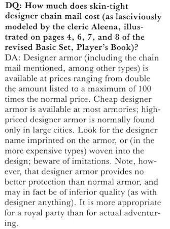 The combination of the fundamentally technological framing of these items and their banality results in a very sub-par book, even given Heard's stated intention that they "provide fun" and a "change of pace." It's particularly baffling, because many of the entries are written by talented and imaginative people, like Ed Greenwood, Jeff Grubb, and even Sandy Petersen. I can only assume that they were all specifically instructed to come up with stuff that would feel appropriate in Wile E. Coyote's Acme Catalog – or perhaps from the minds of Dragonlance's tinker gnomes. The end result is not, in my opinion, either useful as a source of ideas for an ongoing D&D campaign or even of mirth. It's dull, predictable, and, above all, forced, which is a great shame, because I admire many of the book's contributors.