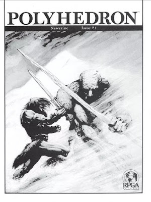 Issue #21 of Polyhedron (January 1985) features a cover illustration by Timothy Truman, who produced a lot of artwork for TSR throughout the 1980s before going on to greater success as a comic book artist. The piece depicts the protagonist of this issue's "Encounters" article, facing off against a creature of para-elemental ice, but, as I'll explain shortly, I have some questions.