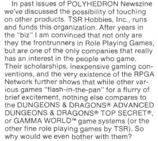 "Notes from HQ" by Kim Eastland is, unfortunately, a lengthy bit of self-congratulatory fluff, singing the praises of both TSR and the RPGA. Eastland once again addresses the question of whether the RPGA or Polyhedron will ever include non-TSR games. His answer is, of course, in the negative, just as Frank Mentzer's had been some issues previously. He elaborates on this in a rather silly way:
