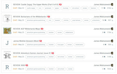 It's quite baffling, especially since these are all very old posts that have existed on this blog for more than a decade. Likewise, none of them, as you can see from the pageview numbers, is an especially popular post that lots of people read and commented upon. The only common element, so far as I can tell, is that five of the six pertain to Judges Guild's Wilderlands setting, though none of them were published by Judges Guild itself. More to the point, I have plenty more Wilderlands-related posts and reviews and none of them were reverted to draft form like these were.
