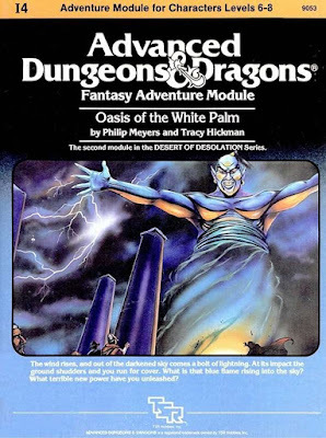 Oasis of the White Palm picks up after the conclusion of Pharaoh, with the characters trudging across the desert. A hex map to facilitate this is provided, along with keyed and random encounters/events. Emphasis is placed on both encumbrance and the need for water during the characters' trek. From the vantage point of the present day, I find this interesting, since it runs counter to the expectation that a Hickman-penned adventure module is somehow not "old school" simply because it includes lots of boxed text and amateur dramatics. As I've noted before, Hickman's 1982–1983 modules are transitional ones that bridge the gap between the early days of the hobby and what would soon come. The Desert of Desolation modules all possess this quality.