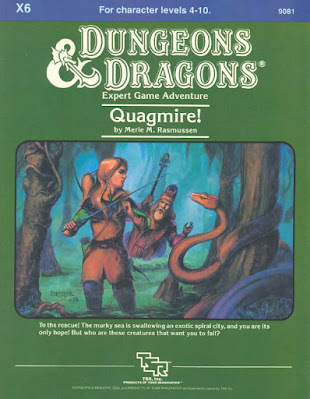 Originally published in 1984 and written by Merle M. Rasmussen, best known as the designer of Top Secret, Quagmire! is designated module X6, indicating that it was intended to support the D&D Expert Set. This fact undoubtedly explains a small part of my affection for the module, since the Expert Set, too, occupies a special place in my heart. The module's premise is that the player characters, while near a seacoast, find a bottle inside of which is a plea written on a piece of parchment. The plea was written by someone who calls himself Molariah, King of the Swamp and Ruler of the city of Quagmire. The king explains that the city, once a center of trade and commerce, languishes under a triple threat of rising waters, plague, and a blockade by their covetous neighbors. He offers a rich reward to anyone who can aid him and his people within six months of his having written the plea, which is how long he reckons the city can hold out. Unfortunately, the plea is not dated, so there is no way of knowing whether it is already out of date by the time the PCs find it.