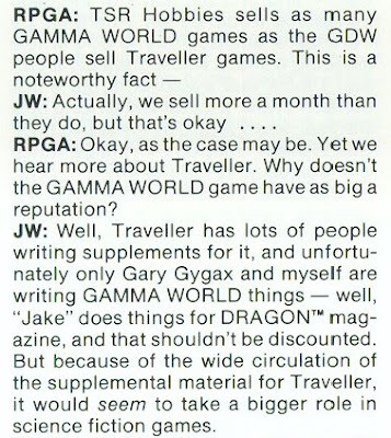 Without verifiable figures, it's impossible to judge the veracity of the claim that Gamma World outsold Traveller on a monthly basis. I certainly think it's plausible, given the popularity of Dungeons & Dragons at the time and the reach of TSR within the hobby. If Ward is indeed correct, then it represents an incredible misstep on the part of TSR that Gamma World was not better supported, because it would have given them another significant source of revenue at the height of the early '80s RPG fad – but then no one has ever claimed that TSR was the most well run of companies at any point in its existence ...