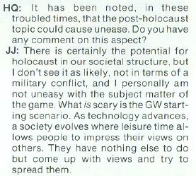 "RPGA Interview with 'Jake' Jaquet" is, as its title suggests, an interview – and a lengthy one at that – Gary "Jake" Jaquet, one of the forgotten employees of TSR Hobbies during the late '70s and early '80s. His name is well known to me because of his involvement in the creation of the first edition of Gamma World. He was also an important figure in the early days of Dragon, where he served in a variety of capacities, including Publisher. As with previous interviews in Polyhedron, this one is full of wonderful anecdotes and trivia about TSR and its products. I could – and probably should – devote an entire post to sharing some of these tidbits. For now, though, I'll share one of them, which feels strangely relevant in our present age.