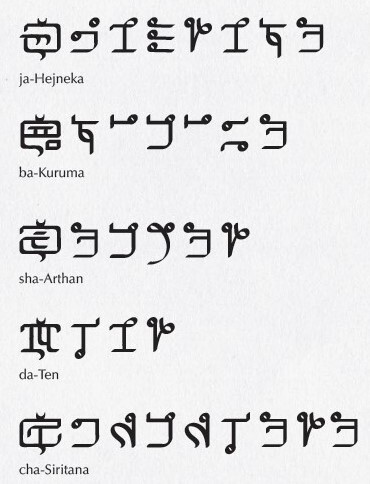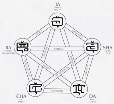 A year and a half ago, I wrote a post about the honorifics associated with the five primordial elements of the sha-Arthan. In the time since, I've been further developing these aspects of the setting, including their visual representation. Thanks to the talents of Zhu Bajiee, who's already provided me with so much evocative artwork, I now have glyphs for each of the elements, as shown below.