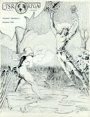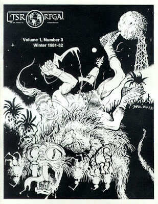 Issue #3 of the technically-still-unnamed Polyhedron newsletter (Winter 1981–82) is notable for numerous reasons, starting with the absolutely gorgeous piece of Erol Otus Gamma World art that graces its cover. It's yet another glimpse of an alternate reality where TSR better supported its post-apocalyptic science fantasy game. Of course, the issue is filled with remarkable – and original – illustrations by TSR's stable of artists, so many, in fact, that I'll probably make another post highlighting some of them.