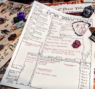That all changed this week. The characters all received a fairly large sum of experience points, thanks largely to their battles against high hit dice monsters (100 XP per HD according to the rules). This sum pushed two characters across the line into 7th level and brought several others closer to that mark. One of the newly minted 7th-level characters is Grujúng hiZnáyu, played by cartographer extraordinaire, Dyson Logos. Dyson celebrates this milestone briefly on his own blog, which is where the image above originally appeared (that's Grujúng's actual character sheet, in case anyone's interested).