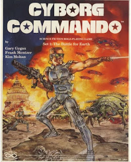 Of course, the company's likelihood of success might have been greater had its inaugural first (and only) original roleplaying game hadn't been Cyborg Commando. Published in 1987, Cyborg Commando is a near-future science fiction RPG written by Gygax, Frank Mentzer, and Kim Mohan. Its premise is that, in the year 2035, Earth is invaded by extraterrestrial beings called Xenoborgs. In order to combat them, mankind turns to the nascent technology of cybernetics to create the titular cyborg commandos – human brains placed inside advanced robotic bodies arrayed with the most advanced weaponry available. Players assume the roles of these commandos as they attempt to rid Earth of the Xenoborgs and drive them back into space. (Since the initial boxed set is subtitled "Set 1: The Battle for Earth," I can only assume there were plans to expand the game's scope beyond this planet.)