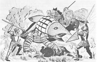 I could offer many more examples from the book and I'm sure readers will remember some of their own favorites. I adored these kinds of illustrations as a younger person, in large part because they emphasized the danger posed by monsters, even things as seemingly innocuous as giraffes.