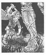 Joe Dever's "Tabletop Heroes" looks at the best techniques for photographing one's painted miniatures. I found it fascinating and very much appreciated the little diagrams that accompanied the article. They showed the placement of lighting, camera, and background and did a great job of illustrating the principles Dever discusses. "The Travellers," "Gobbledigook," and "Thrud the Barbarian" are all here as usual. "Thrud" pokes fun at superheroes by having the tiny-headed barbarian face off against the All-American Legion of Incredibly Stupid Heroes, such as