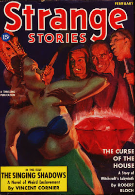 One Bloch's better early stories in my opinion is "The Sorcerer's Jewel," which first appeared in the February 1939 issue of Strange Stories (which also featured another tale by Bloch, "The Curse of the House," in the same issue). To some degree, that's because the story is only tangentially connected to the Cthulhu Mythos and that gives Bloch some space to develop his own ideas more fully. And while those ideas certainly owe a debt to Lovecraft, notably the short story, "From Beyond," Bloch makes them him own.