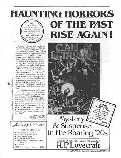 I always enjoy looking at old consumer product catalogs, especially those associated with RPG companies. Here's a good example from Chaosium's Winter 1982 catalog, advertising the original Call of Cthulhu boxed set, along with a "special designer's limited edition" set of 200 copies that, for $5 more than the standard one, is signed by the author and includes Shadows of Yog-Sothoth to boot – not a bad deal! [My aged eyes are mistaken; the price is $35 for the limited edition, which isn't quite as good a deal as I thought – JM]