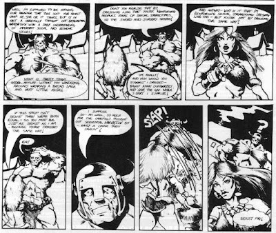 "Thrud Gets a Social Conscience" is this issue's installment of "Thrud the Barbarian," humorously addressing the claim that the comic (and, by extension, the entire genre of sword-and-sorcery) is sexist. This leads to an amusing exchange between Thrud and his occasional female guest star, Lymara the She-Wildebeest, about how her attire reinforces negative sexual stereotypes.