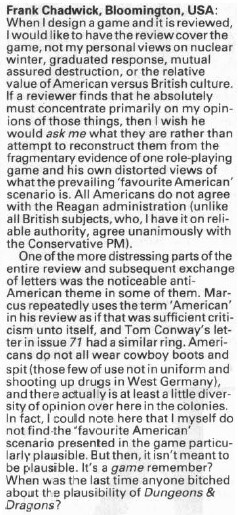 That brings us to another highlight of this issue. You may recall that, back in issue #68, reviewer Marcus L. Rowland gave a very negative review to GDW's Twilight: 2000. This led to a flurry of letters in issue #73, both pro and con Rowland's review. With this issue, Frank Chadwick, designer of the game weighs in and he pulls no punches.