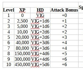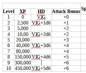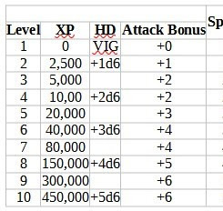 I'm putting the finishing touches on the latest draft of the character classes for Secrets of sha-Arthan. In doing so, I'm finding myself befuddled by the clearest way to present certain bits of rules information. A good case in point is the presentation of accumulated hit dice by level.