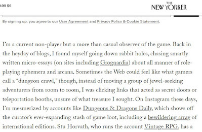 There's apparently a D&D movie in the theaters, something of which I was dimly aware but never took much serious interest in, for reasons I've elucidated in the past. Consequently, I haven't paid attention to the commentary surrounding it and thus would have completely missed out on Ed Park's review/meditation on "the magic and melancholy of Dungeons & Dragons" had it not been pointed out to me. Park's article has much to recommend it. For my present purposes, though, its main virtue is its reference (and link) to this blog in its third paragraph.