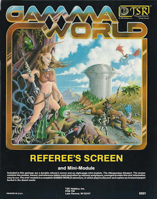 The first edition of Gamma World was published in 1978, but did not receive any official support from TSR until 1981, when the company released both the Referee's Screen and Legion of Gold. What makes the former worthy of discussion is its inclusion of an 8-page "mini-module," written by Paul Reiche III and developed by Lawrence Schick. Entitled "The Albuquerque Starport," it offers not really an adventure but the description of three different locales, each of which could serve as the basis for one or more scenarios on their own, or in tandem.
