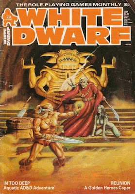 Ian Livingstone's editorial mourns the loss of Imagine magazine, which ceased publication with its thirtieth issue. His words seem genuinely heartfelt, especially when he notes "the good relationship between the White Dwarf staff and their opposite numbers." At the same time, Livingstone uses this occasion to downplay any suggestion that there is a decline in interest in the hobby of roleplaying. He likewise crows that "White Dwarf's circulation continues to increase," which, while undoubtedly true, seems – to me anyway – to be in slightly poor taste, given the circumstances.