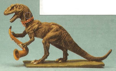 "Monstrous NPCs" by Paul Ormston offers up three fully fleshed-out monster NPCs, each a unique individual with his own personality, history, and goals. There's a lizard man prince, a jovial stone giant, and an intellect devourer masquerading as a human. Though each description is short, they're all interesting. They also nicely demonstrate that even monsters can benefit from characterization. "Chop and Change" is Joe Dever's article on modifying miniature figures by adding or subtracting elements from the original molds. He includes several photos of conversion techniques in action, including one of a dinosaur playing a saxophone that I found rather amusing for some reason.