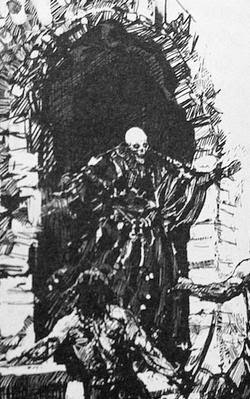 The face of the man was a bare white skull, in whose eye sockets flamed livid fire!