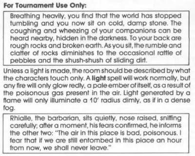 Within the very specific context of a module written for tournament use, particularly one with a strict real time limit, the inclusion of boxed, descriptive text makes a great deal of sense. After all, it would be unfair to the players participating in the tournament if some referees were more loquacious than others in their descriptions, time being a valuable resource. Fairness would likewise demand that each group of players be given the exact same descriptions of the dungeon's rooms. Once again, I say this makes perfect sense within this very specific context.