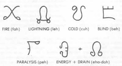 As anyone who's read it knows, the AD&D Dungeon Masters Guide contains not just excellent advice and suggestions to the referee, but also some odd and easily overlooked details. Take, for example, these examples of possible glyphs of warding at the bottom of page 41: