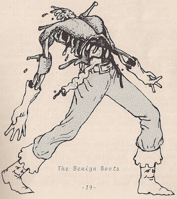 That said, I'm honestly not certain I'd make use of almost any of the new spells presented here. A great many of them are useful only in very specific circumstances, while others are "game-y" in conception (e.g. competent cartography, which prevents the caster from making a mistake in his mapmaking). Others are simply so idiosyncratic that they likely reflect the circumstances of the writers' own campaigns, such as the benign boots, which transports the caster's corpse back to a safe locale via the Astral Plane. Now, I genuinely appreciate such idiosyncrasy. Indeed, I am a strong advocate for referees and players making their campaigns downright odd and impenetrable to outsiders, but, of course, doing so gets in the way of selling to lots of copies of your latest book, which may explain why we don't see efforts like The Necromican much anymore – a pity!