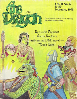 Obviously, this article was published before 1980's Deities & Demigods, whose early printings included a different presentation of the Cthulhu Mythos. As a kid, my copy of the book was one of the later printings that didn't include this chapter (or that of Moorcock's Melnibonéan Mythos) and indeed I didn't even notice its absence until I was in college. My roommate has a copy of one of the early printings and I was flabbergasted when I saw its extra chapters. The saga of the inclusion and removal of the Cthulhu and Melnibonéan material from the DDG is well known, I think, so I won't repeat it here. However, I wonder if it left a sufficiently bad taste in TSR's mouth that Dragon would thereafter include almost no Lovecraft-related material in its pages for years after the event.