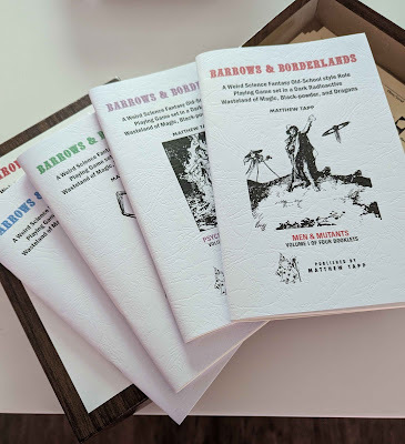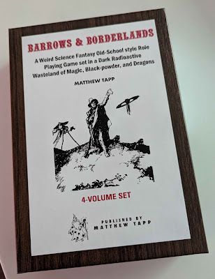 Last month, I mentioned Barrows & Borderlands, a new old school RPG created by Matthew Tapp. A couple of days ago, my copy of the 4-volume boxed set arrived in the mail and I was so impressed with it that I wanted to show it off. Here's the front of the OD&D-inspired woodgrain boxed set.