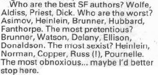 For a change, Dave Langford's "Critical Mass" includes discussions of books I've actually read, like Donald Kingsbury's Geta (released in the USA under the title Courtship Rite, which is how I know it). It's a strange work of imaginary socio-anthropology about a colony of humans who survive on a hostile planet where only a handful of Earth plants can grow and whose diet must be supplemented by cannibalism. The book is better than it sounds! Langford also reviews Jack Vance's Lyonesse, which he likes less than The Dying Earth and its sequels, an opinion I share. Later in the column, Langford offers his opinions on the best, worst, most pretentious, and most sexist SF authors.