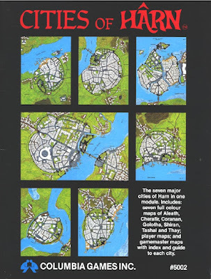 In the end, Cities of Hârn is, I think, pretty typical of the early Hârn products in being more like a "sketch" the referee is expected to fill in according to the needs of his own campaign rather than a fully fleshed out product ready to be used "out of the box." At the same time, its lovely maps and their keys are precisely what I wanted out of a product like this and more than justified the cost and relative difficulty it took to obtain a copy. Even though I never succeeded in running a Hârn-based campaign, I made good use of some of the maps in my own setting, which is about as high praise as I could have given a RPG product in those days.
