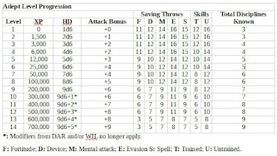 DisciplinesAn adept uses her inherent psychic ability to activate a number of disciplines individually or in combination, according to the Adept Level Progression table below. Disciplines are chosen by the player from among the following:Clairvoyance: An adept can see through or into opaque or solid material within 30’ for up to 1 turn per level.Control Self: An adept exerts psychic control of her own body for 1 turn per level, during which time she can suspend normal bodily functions (stop or slow heartbeat, respiration, etc.) without a detriment to normal physical or mental performance; gain total recall of memory; or perform minor feats of strength, agility, and/or mental prowess. The referee has final say on the effects of these feats.ESP: By concentrating for 1 round, an adept can perceive and understand the thoughts of living creatures within 60’ for 1 turn per level. A target detects the adept’s use of this discipline with a successful WIL check. An unwilling target may make a mental attack save to resist. While reading thoughts, the adept may move but cannot attack.Fear: An adept can cause a target within 120’ to flee for 1 turn per level, unless it successfully makes a mental attack save.Healing Trance: By meditating intensely for 1 turn, during which time she is insensate and unable even to defend herself, the adept can heal herself 1d6+1 hit points per use. At 6th level, the trance heals 2d6+2 hit points per use. Alternately, the trance may be used to grant a +4 fortitude save bonus against one poison or disease per use.Illusion: An adept can create a visual illusion of her choosing so long as she concentrates. Within a range of 120’, an adept can animate an illusion within a 6’ cube +1’ per level. Targets who succeed at a mental attack save recognize the illusion for what it is. Illusory enemies have DR 10 and vanish if successfully struck. Damage dealt by such enemies is not real. A character who appears to die actually falls unconscious, a character petrified is paralyzed, and so on. Such effects last 1d4 turns.Mind Shield: An adept can shield her mind for 1 turn per level, granting her a +4 bonus to any saving throws against mental attacks of any kind for its duration. This discipline requires little concentration, so the adept is free to attack or use other disciplines while it is in effect.Mind Blast: An adept directs a blast of psychic energy at a target within 60’, dealing damage equal to 2d6 + 1 per level of the adept. A successful mental attack save halves the damage.Psychometry: The adept sees into the past of whatever single object she touches, understanding its function purpose, origins, and who has touched it in the last 10 years per level.Suggestion: An adept’s words take on a supernatural potency. Up to one HD of persons per level of the adept must make a successful mental attack save or follow her suggestion for 1 round per level of the adept. (If the suggestion would endanger a subject, that subject automatically saves). This discipline is language-dependent and may be used in conjunction with telepathy. The subject is unaware of the manipulation, but, after its duration, he realizes he has been psychically influenced. Suggestion may only be used once per turn against the same subject.Telekinesis: An adept can move solid objects with a remote psychic “hand.” The remote hand can be projected to a range of 20’ + 5’ per level and lasts for 3 rounds per level. The amount of weight manipulated is equal to 3 +1 per level VIG (see Encumbrance ). Movement speed is 10’ per round per level.Telepathy: An adept can establish bidirectional mental communication with one other living intelligent creature within 90’ for 1 turn per level. Every four levels, the adept can add another such creature to her mental communication. The creature need not share a language with the adept. Communication is limited to conscious thoughts but can include visual, auditory, tactile, and olfactory components.Frequency of UseTwice per day per level, an adept may use any combination of the disciplines she has developed. For example, a 2nd-level adept has developed three disciplines and may use any combination of them four times per day in total. For example, the adept could use ESP and suggestion once each and telepathy twice or ESP twice and suggestion and telepathy each once, or in any other combination.