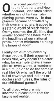 Issue #54 is also memorable for its editorial by Ian Livingstone, which touches on the issue of the Satanic Panic. I reproduce his words here in their entirety:
