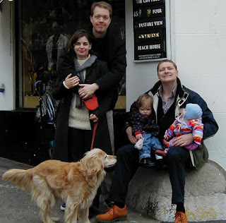 Rachel, me, and brother-in-law Brian holding our daughter Lily and niece Moya on his knee, on a long-since Welsh holday. The dog was called Toby. I like the suspicious look Lily is giving it.