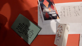 But the crowning touch was presentation of a how-to on making a mini-chapbook, a skill that Kevin has down to a fine art. Because I first learned how to make these little books from Kevin, I've always referred to them as Kev-bukis.
