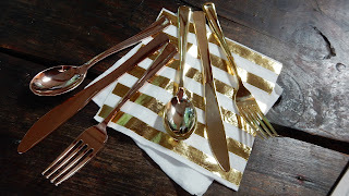 Oh, just look at all that shiny stuff -- right down to the gold-striped serviettes. Shiny or what.