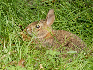 The rabbit in the photo is one that used to frequent our front yard, very likely because we're the 'bad' house where the lawn is only rarely cut, in keeping with the natural look of the rest of our yard.