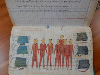 This morning, poking through a stack of books in the living room, I once again opened a book that tells a story of life in such a school. Called The Ledgerbook of Thomas Blue-Eagle, it's a contemporary re-creation of just the kind of books children were given to keep their lessons in -- leftover ledger books donated by the local bank. No matter that the paper was lined for keeping accounts; children kept their own accounts, in this case, with details of a boy's young life.