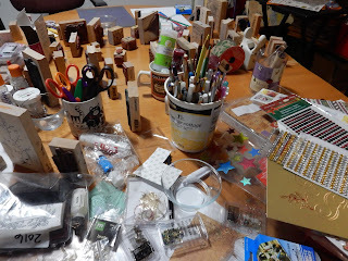 It's always kind of a crazy mess, with stamps and stickers and all kinds of assorted papers and pencil crayons and whew! But amazingly, quite a few lovely cards are the result, and all of those go to special friends and family members.