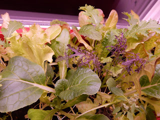 However, this December, my brilliant partner has taken the notion of home-grown one step further: you might have to call it Indoor Farming. Obviously, our little set-up isn't anything like the vertical farming models that are easy to find on the Internet, nor is it hydroponic, as our plants grow in soil.