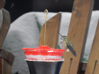 We're in the midst of a very cold spell, one that's very unusual for where we live. Last time I checked, the thermometer read minus ten. That's Celsius; in Fahrenheit it's 14. So when our brave little hummingbird came to the feeder, we worried the liquid would likely freeze. Sure enough, when we brought it in, ice crystals were already starting to form. But then the Dear Man came up with one of his brilliant ideas -- the lamp base from the lava light appeared to be just the right size to hold the feeder. So it, combined with a tiny pie tin (with a few holes punched into it), has turned into a warm spot for the hummer to spend an extended dinner visit.