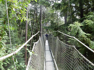 That's where we were the other, walking through the tree canopy at UBC's Greenheart TreeWalk. Even though we were high up (several storeys at many points along the route), it mostly felt a bit 'swingy' though the rope handles on either side were reassuring enough for even a chicken like me. Something I thought about while I was making the walk was the Wallenda family, who made tightrope walking a multi-generational career. I kept trying to keep my feet walking a line that followed the centre of the walkway. This only convinced me I could never have learned to walk on a rope, especially not one that didn't have a catch-net below. Yikes!