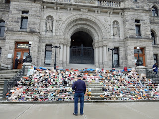 Today is the first time we in Canada are observing National Day for Truth and Reconciliation. Many businesses are closed, though not all. As is so often the case with a newly introduced tradition, it takes some of us longer to learn than others. I was fortunate to be in Victoria, our provincial seat of government, earlier this week. It was good to see the steps of the Legislature Building filled with reminders of the 215 children whose graves were discovered earlier this year.