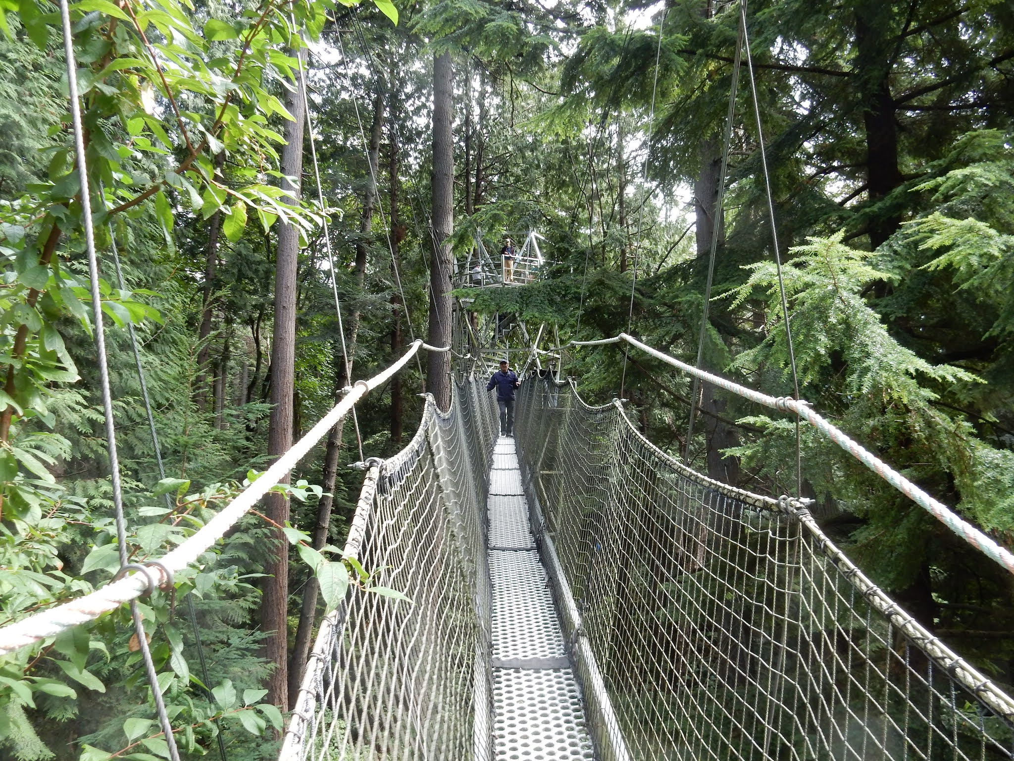 That's where we were the other, walking through the tree canopy at UBC's Greenheart TreeWalk. Even though we were high up (several storeys at many points along the route), it mostly felt a bit 'swingy' though the rope handles on either side were reassuring enough for even a chicken like me. Something I thought about while I was making the walk was the Wallenda family, who made tightrope walking a multi-generational career. I kept trying to keep my feet walking a line that followed the centre of the walkway. This only convinced me I could never have learned to walk on a rope, especially not one that didn't have a catch-net below. Yikes!