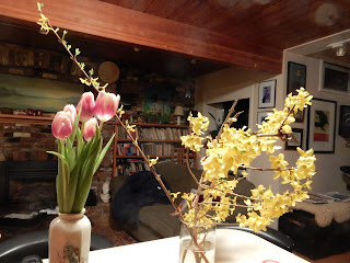 While I admit that the tulips are store-bought (though raised on Vancouver Island), the forsythia brancches are ones I brought in from outside.